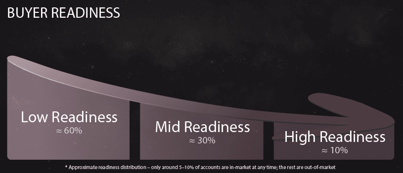 Buyers move through low, mid and high readiness, not neat funnel stages. Most aren’t actively buying.